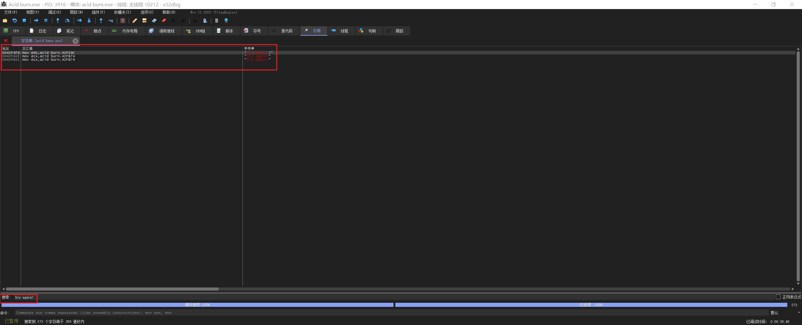 这时在下面的搜索区域搜索字符串,x64dbg 会自动筛选出所有类似的字符串。