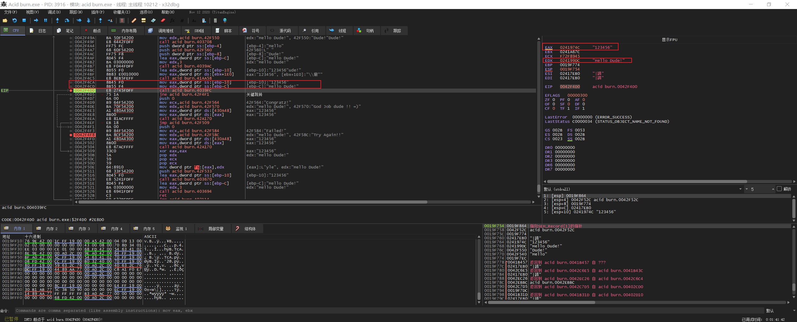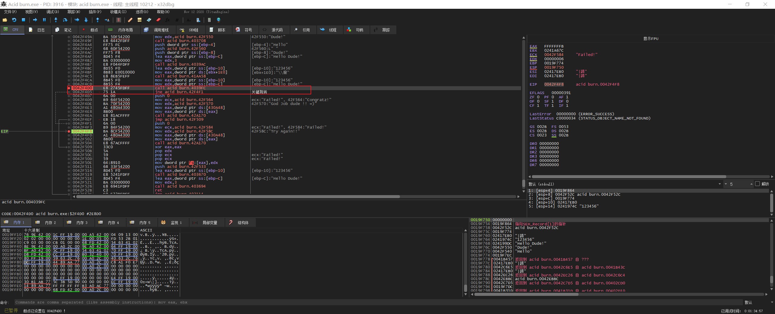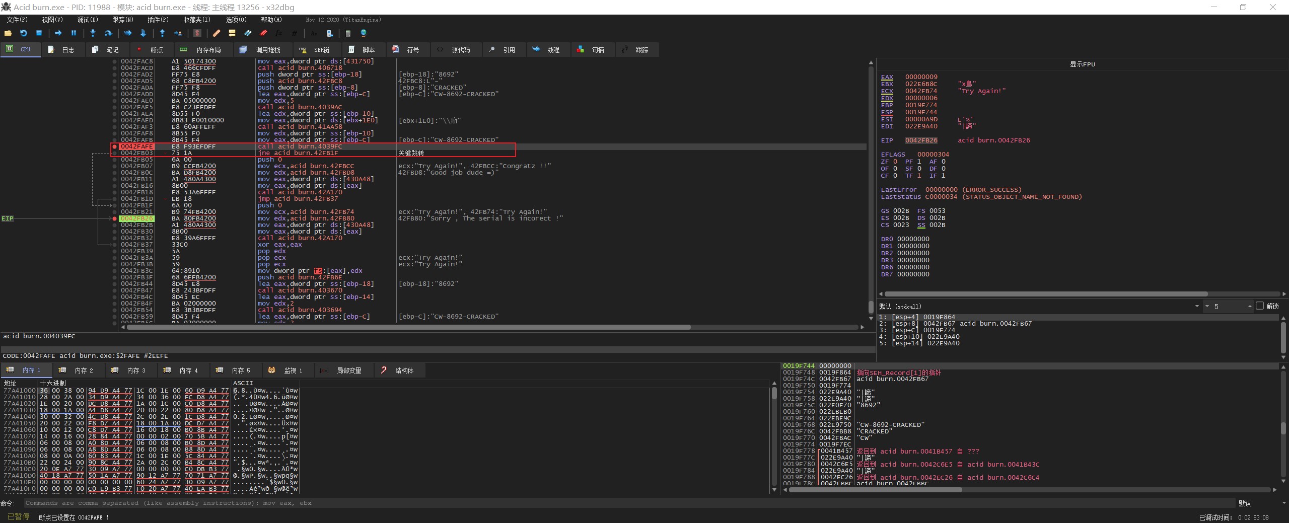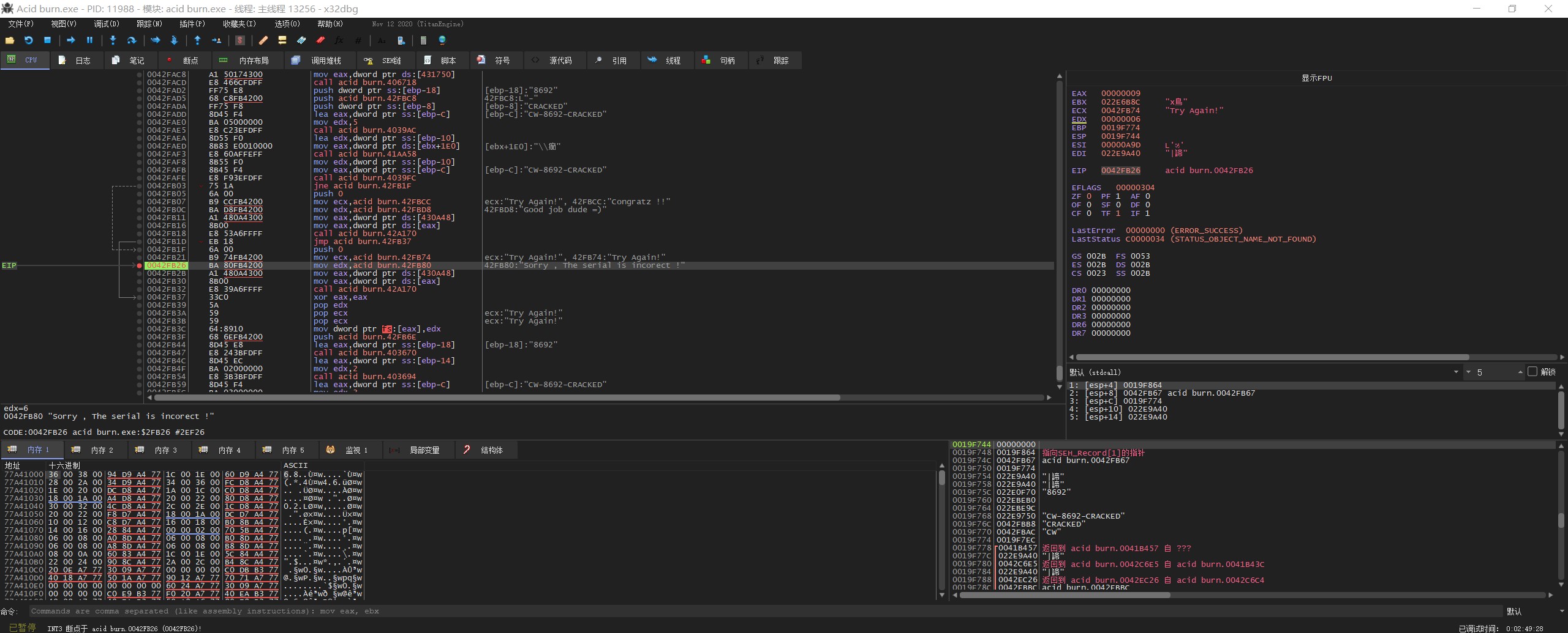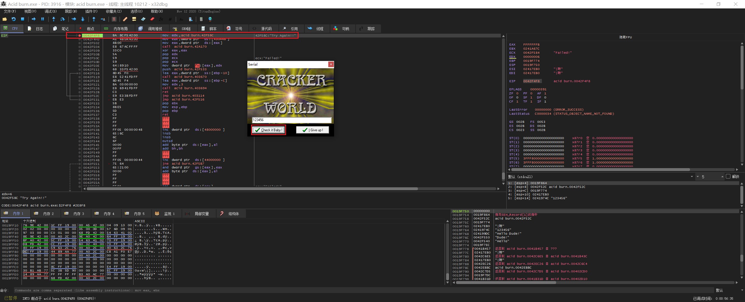 程序运行后,在 “Serial” 中输入任意字符串,并点击 “Check it Baby!”。可以看到此时程序停在了 “0042F4F8” 这个内存地址上。