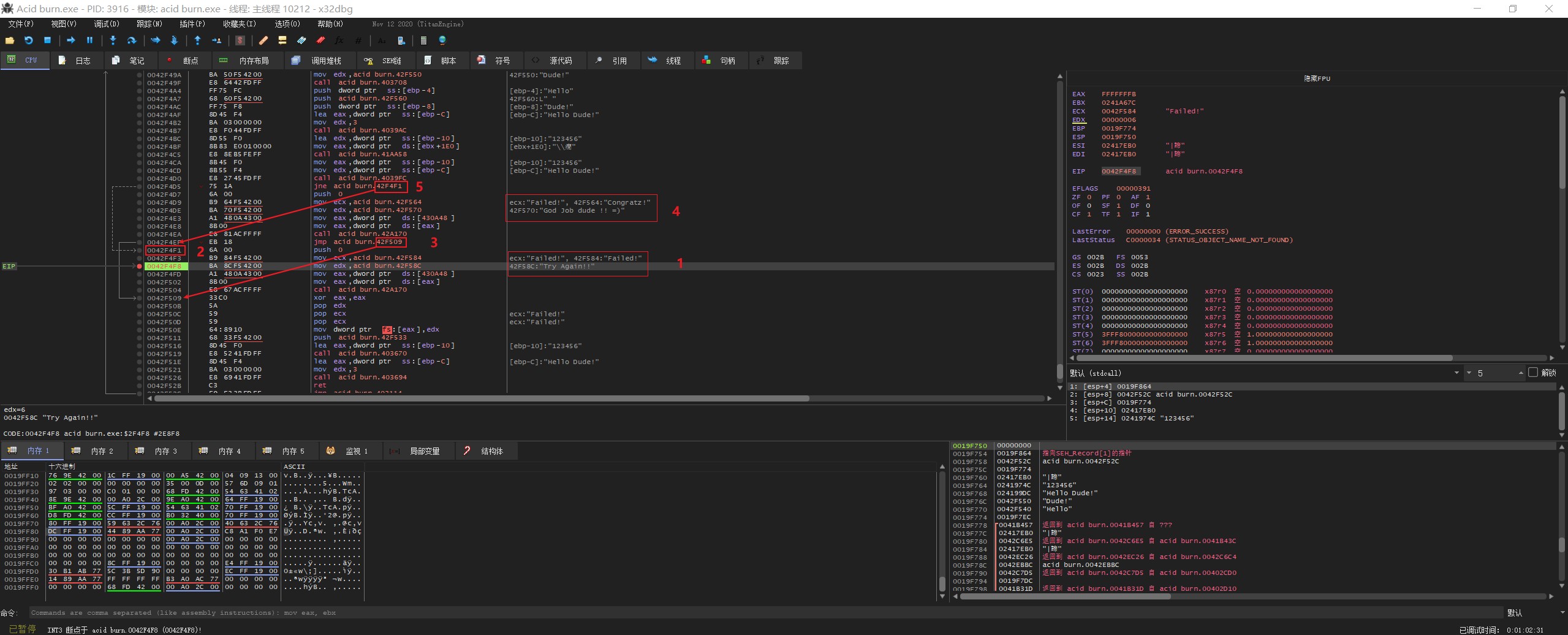 从断点处往上查看错误消息和跳转指令,仔细查看可以看到在 “0042F4D5” 处有个关键跳转指令。很明显可以看到,只要跳转成功程序就会输出 “try again”,不跳转程序就会输出 “God Job Dude”。所以只要这里不跳转程序就能破解成功。