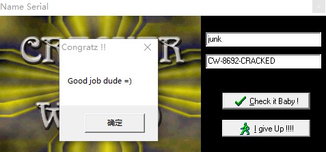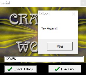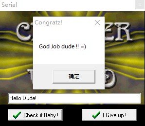 然后重新按 “F9” 运行程序,并点击 “Check it Baby!”,此时程序停在 call 命令处。在右边的寄存器的窗口可以看到 EAX=123456;EDX=Hello Dude!,下面的 call 命令应该是判断这两个字符串是否相等,所以程序正确的序列号应该是 “Hello Dude!”。