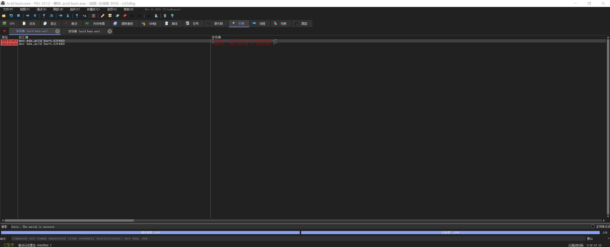运行到主模块,并搜索字符串 “Sorry , The serial is incorect!”,然后在所有命令上设置断点。