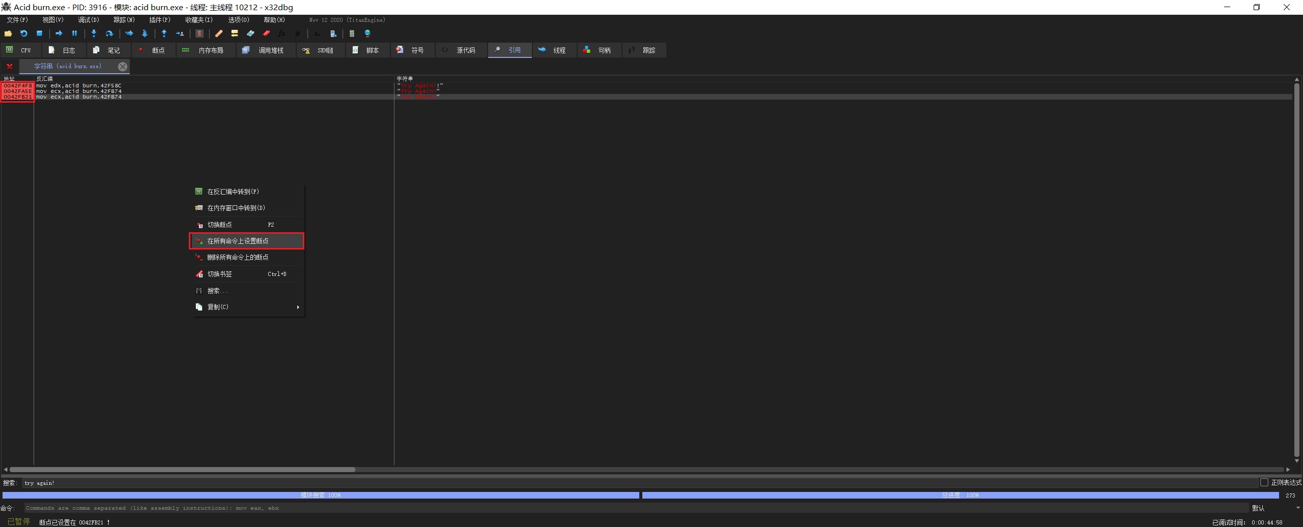 但是这边有三个字符串,不知道该如何选择。在不知道具体是哪个字符串的时候我们只需要给满足条件的字符串下断点,右键—> 所有命令上设置断点。