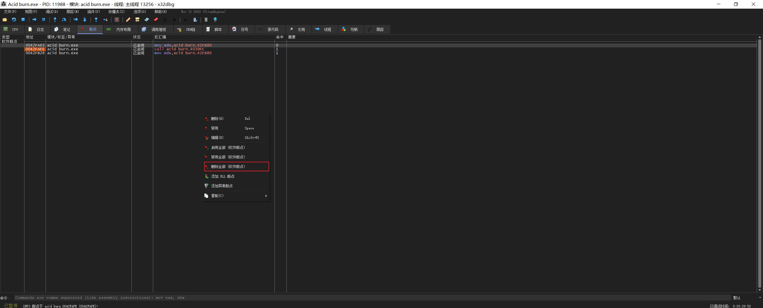 删除之前设置的断点,点击 “断点” ,右键—>删除全部。然后再进入 CPU 处,使用 “ctrl+f2” 重新加载程序。