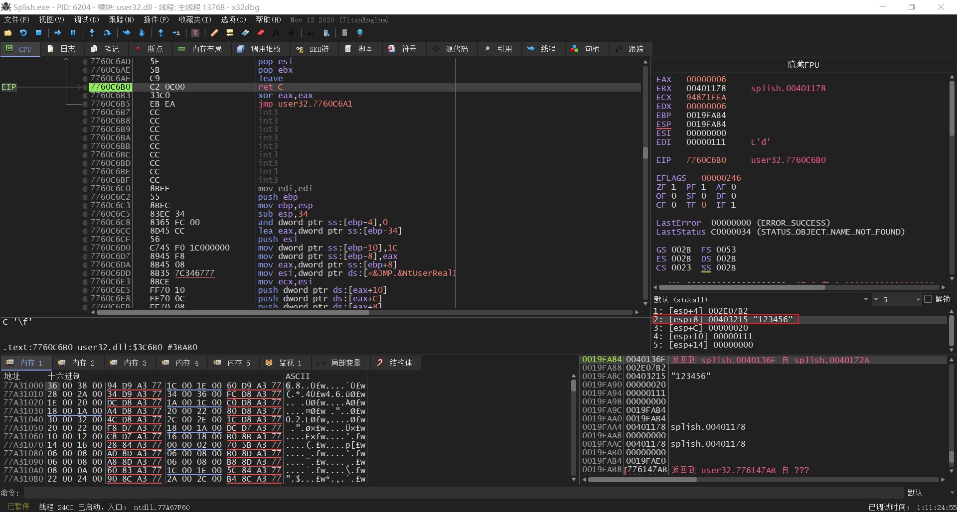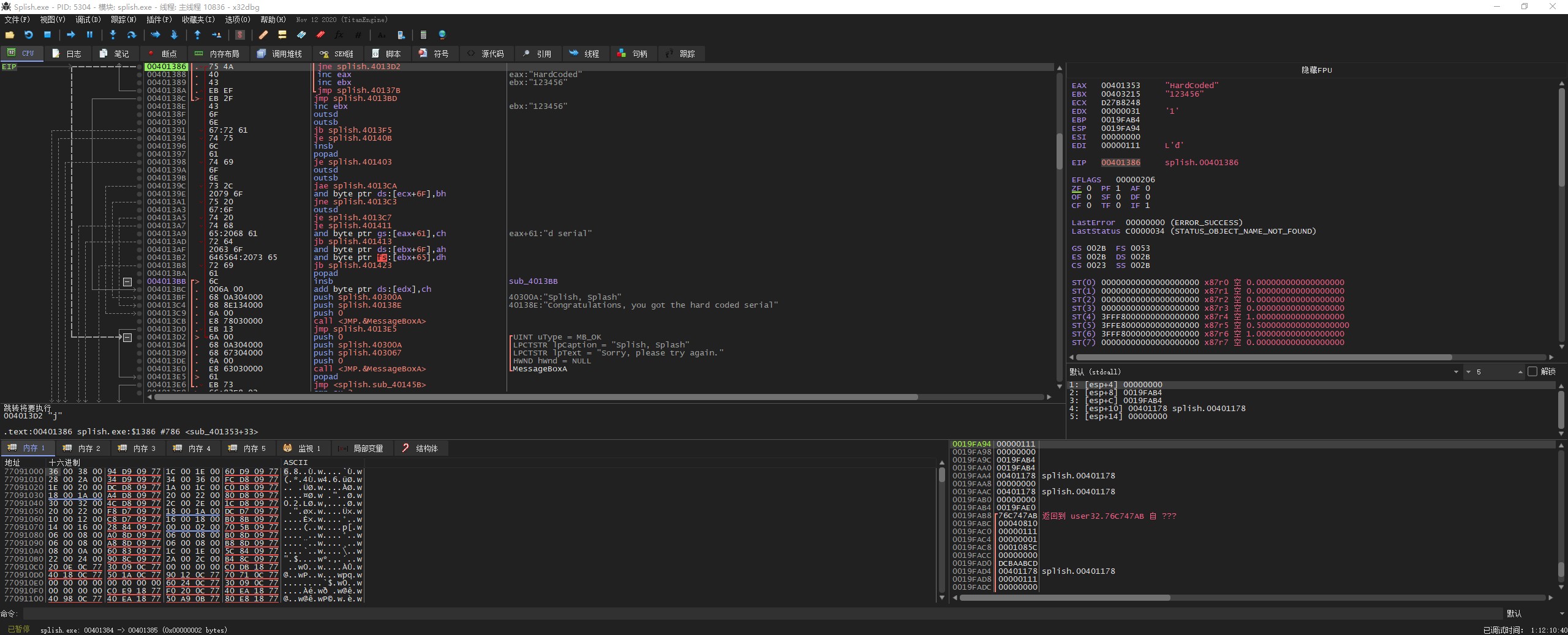 我们再双击右边寄存器窗口的 EIP,返回原来地址处。