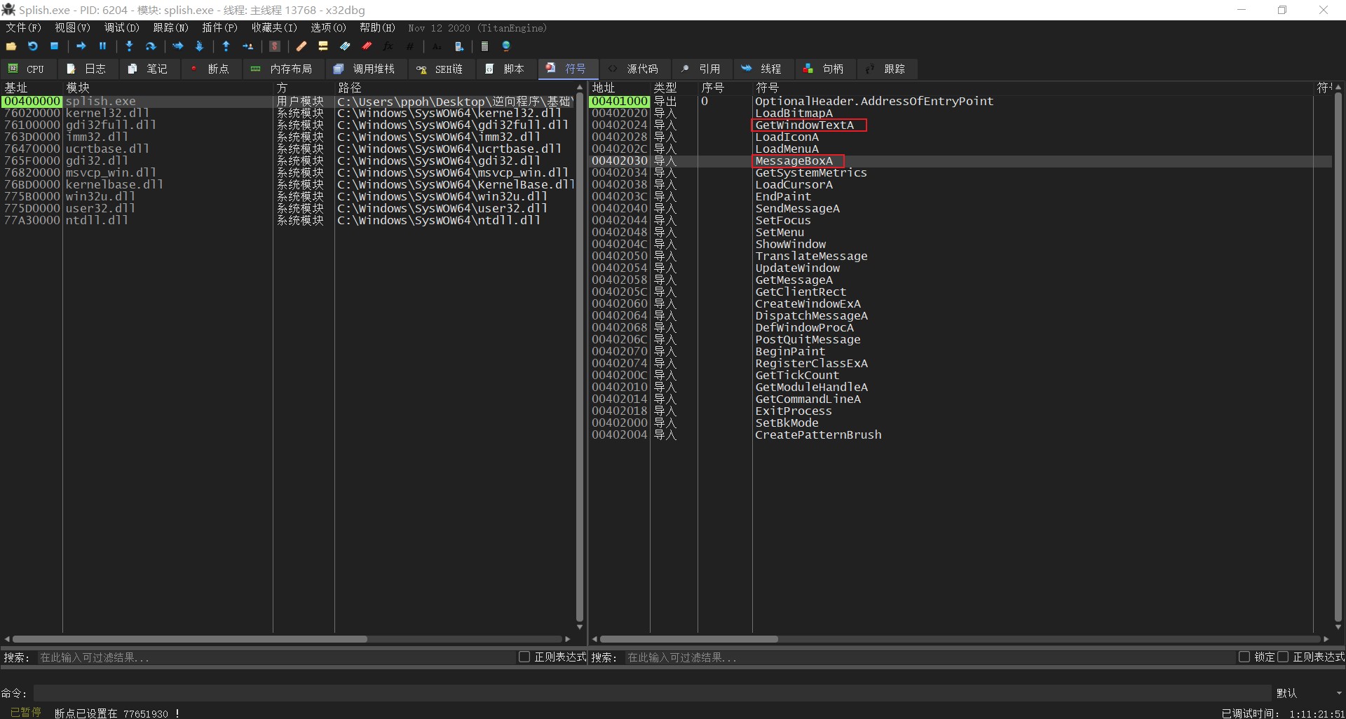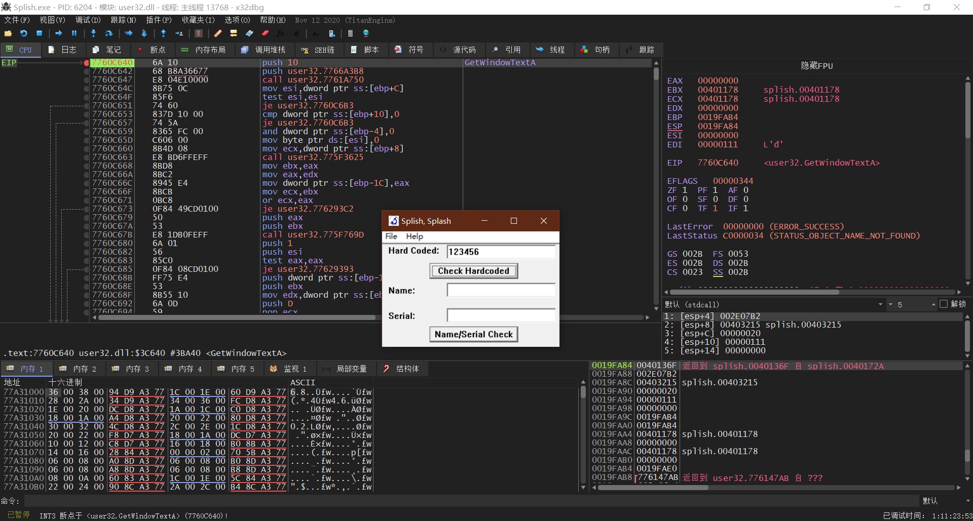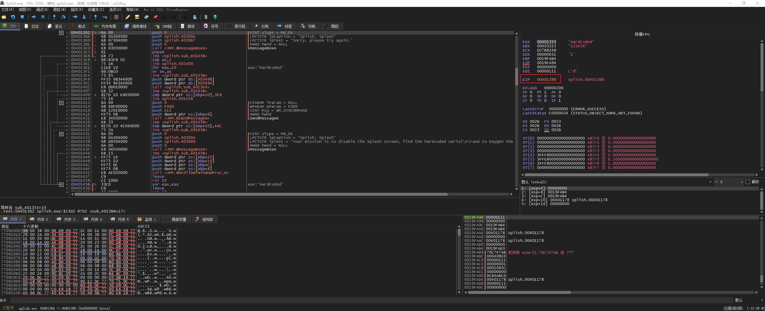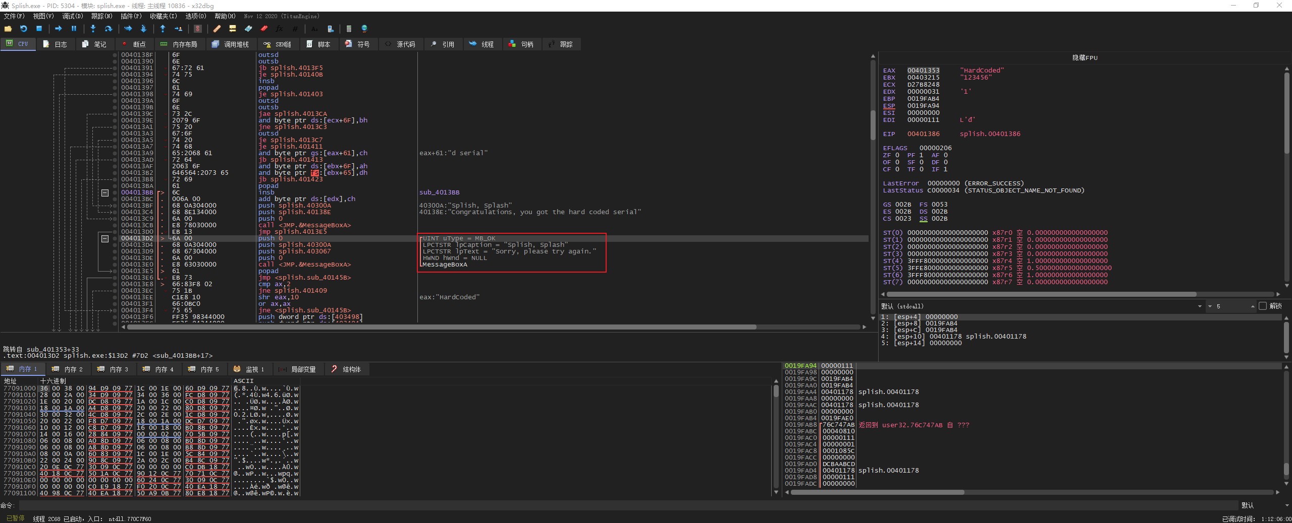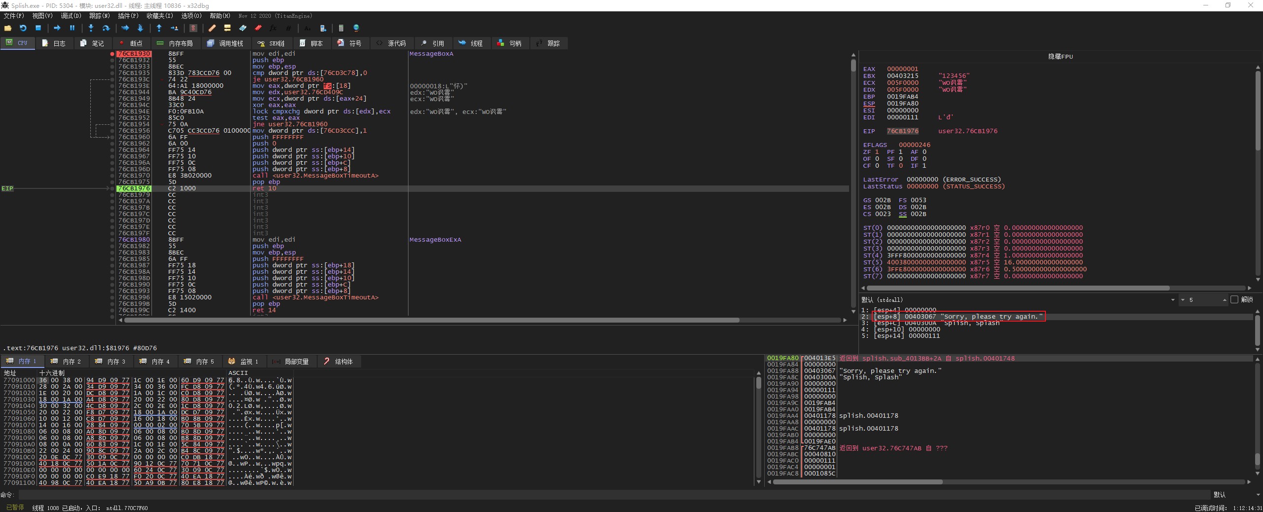我们继续执行,可以看到 MessageBoxA 函数存储着错误信息。