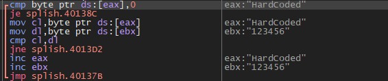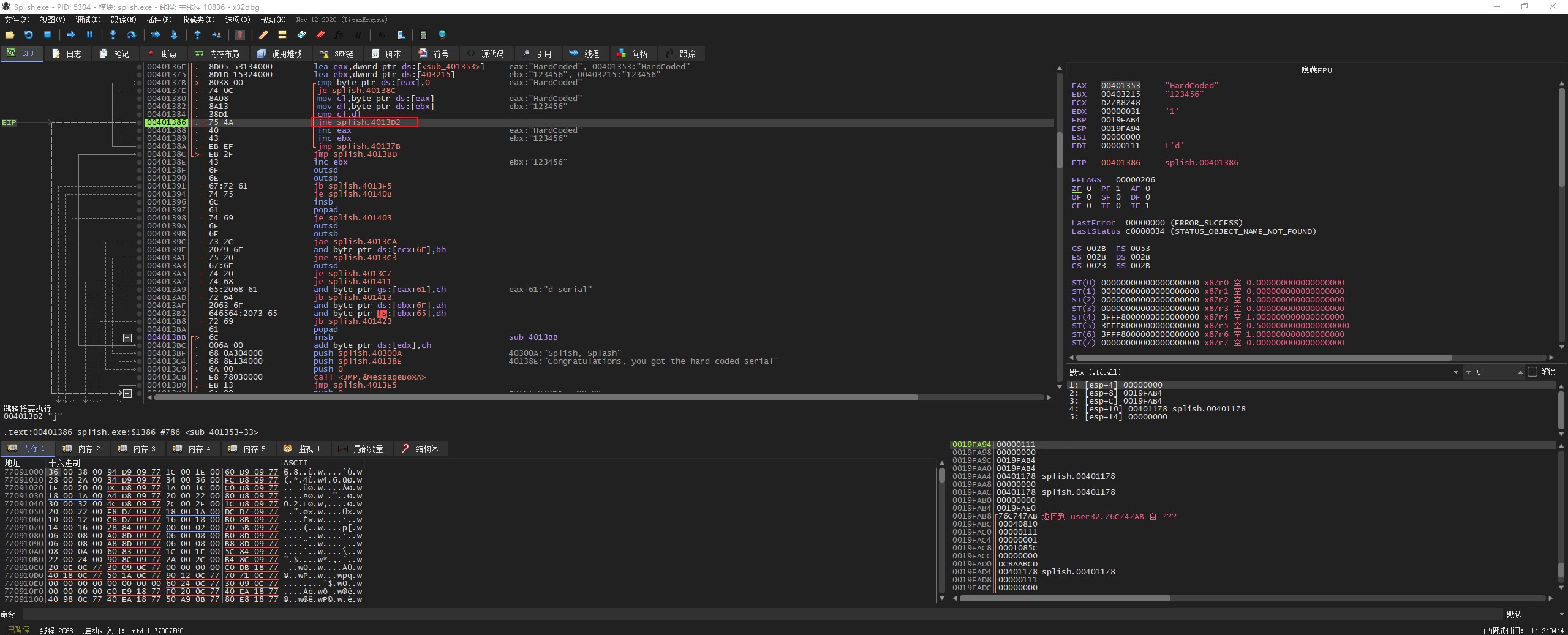 继续按 “F8” 步过执行,可以看到后面用 lea 指令,把 eax 和 ebx 指向两个字符串的地址处。然后开始循环判断这两个值是否相等。